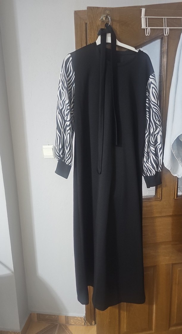 Kadınlar için siyah uzun elbise, salaş kesim ve zebra desenli uzun kollara sahiptir. Yüksek yakalı ve drapeli tasarımdadır, yumuşak sentetik kumaştan üretilmiştir. 40 42 bedene uyumludur