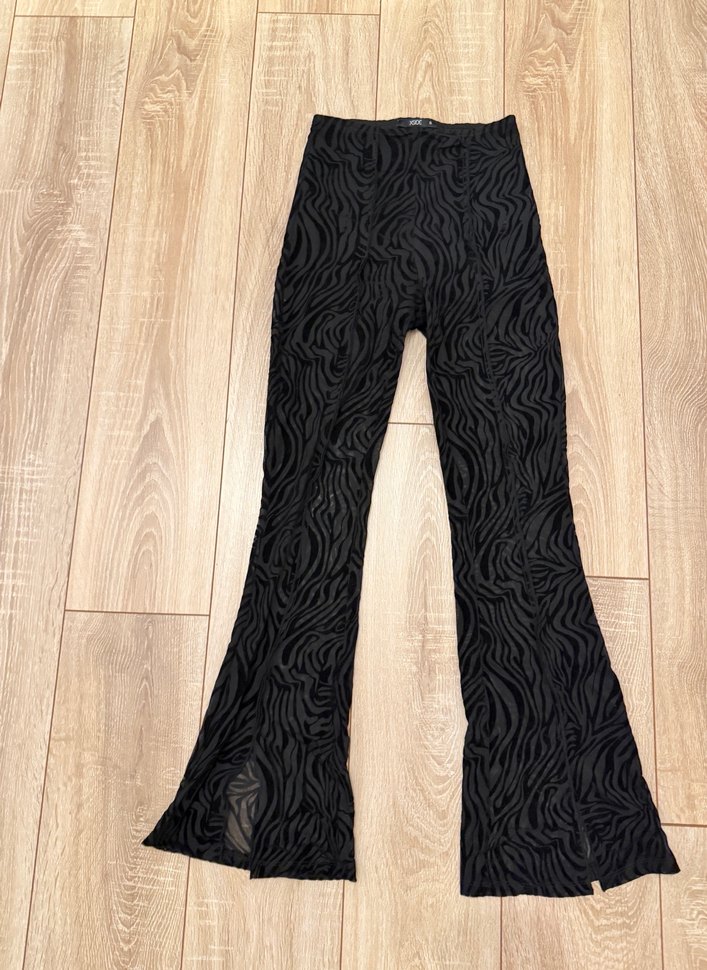 Yumuşak sentetik kumaştan, zebra desenli, yırtmaçlı ve ispanyol paça kesim siyah pantolon. Rahat ve bohem tarzda günlük kullanım için uygundur desenleri kadifedir.