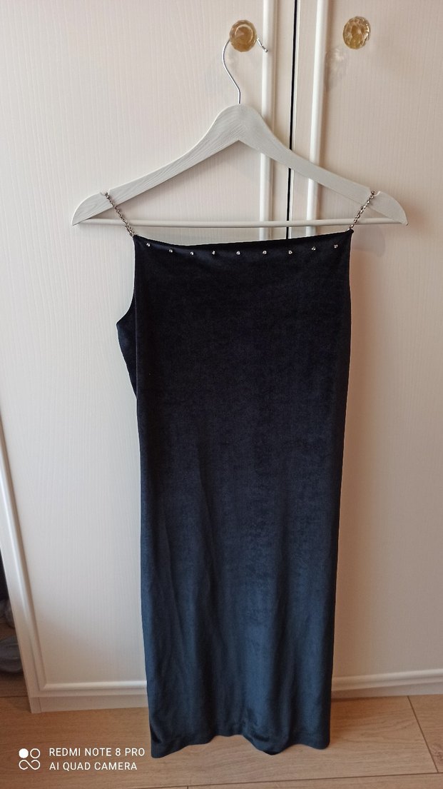 Siyah uzun elbise, zincir askılar ve drapeli detaylarla fit kesim ve kayık yaka sunar. Minimalist gotik tarzda, günlük kullanıma uygundur.