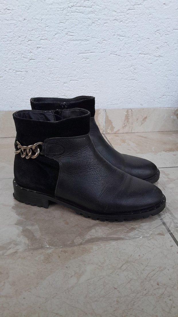 Siyah deri biker botlar, zincir detaylı ve blok topuklu. Trendy casual ve sokak stiline uygun.