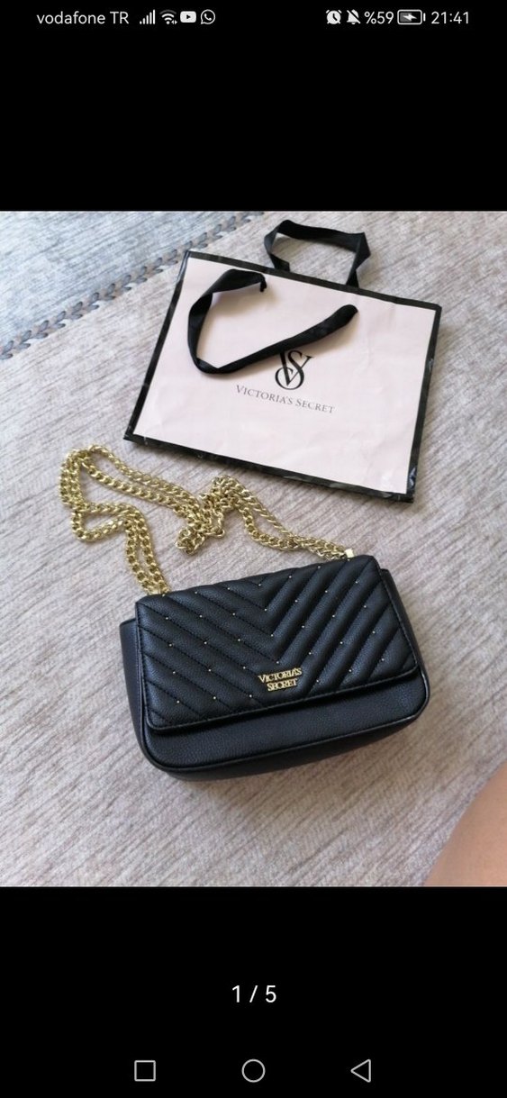 Parlak siyah deri, zincir detaylı kadın çanta. Baskılı desen ve Victoria's Secret logosu bulunur. Cesur sokak tarzına uygunmuş, günlük kullanıma ideal.