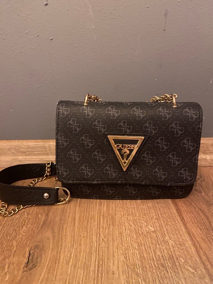 Zincir detaylı, baskılı desenli siyah deri çanta. Modern klasik Paris tarzını yansıtan Guess markası, günlük kullanım için uygun. Guess muadil çanta yeni gibi