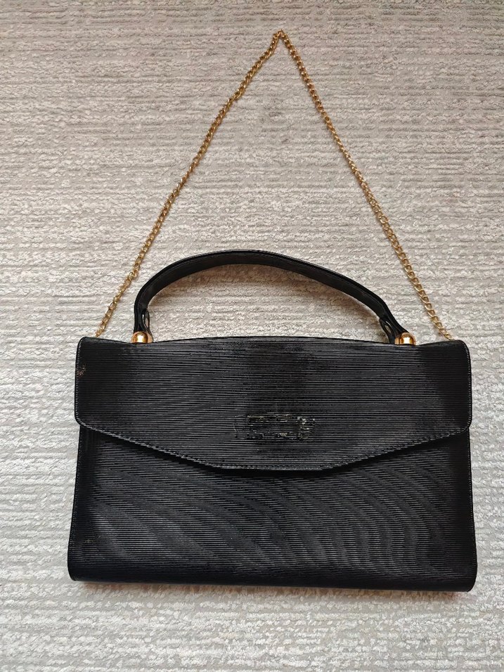 Siyah, parlak ve ipeksi dokulu bu kadın portföy çanta, zincir detaylı ve elde tutma saplıdır. Modern klasik tarzda, ofis için uygundur. sadece üstündeki detay kopmuştur oraya her türlü şey takılabilir o sebeple uygun koydum