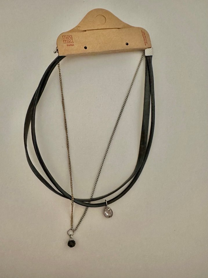Üç katlı zincir detaylı ve taşlı kolye. Tek bir kolyedir. Hediye geldi, bir veya iki kez kullanıldı. Yeniden farksız.