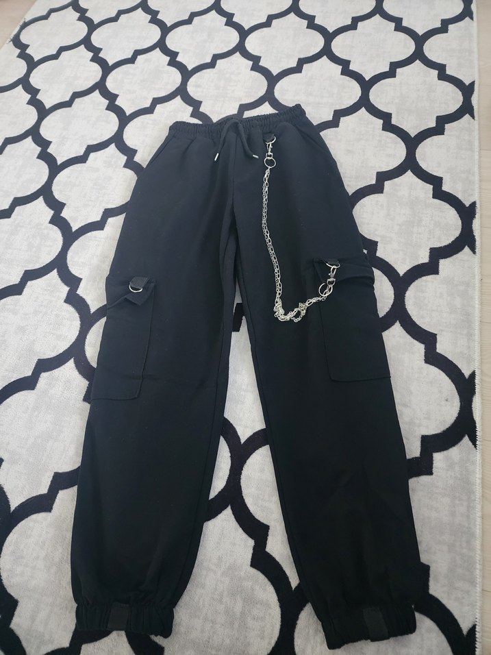 Siyah, zincir detaylı, salaş kesim kadın kumaş pantolon. lastikli paça yan cepli ve sentetik kumaştan, günlük sokak stiline uygun. S bedenden L bedene kadar uygundur
