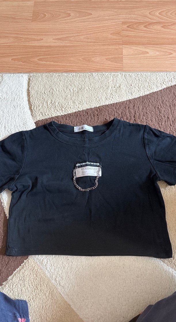 Kısa kollu, yuvarlak yakalı, bol kesim, baskılı ve zincir detaylı, sentetik kumaştan.