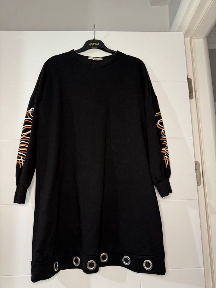 Siyah, uzun kollu, bol kesim tunikte baskılı kollar ve etek kısmında zincir detayları bulunur. Rahat sokak stili için uygundur.