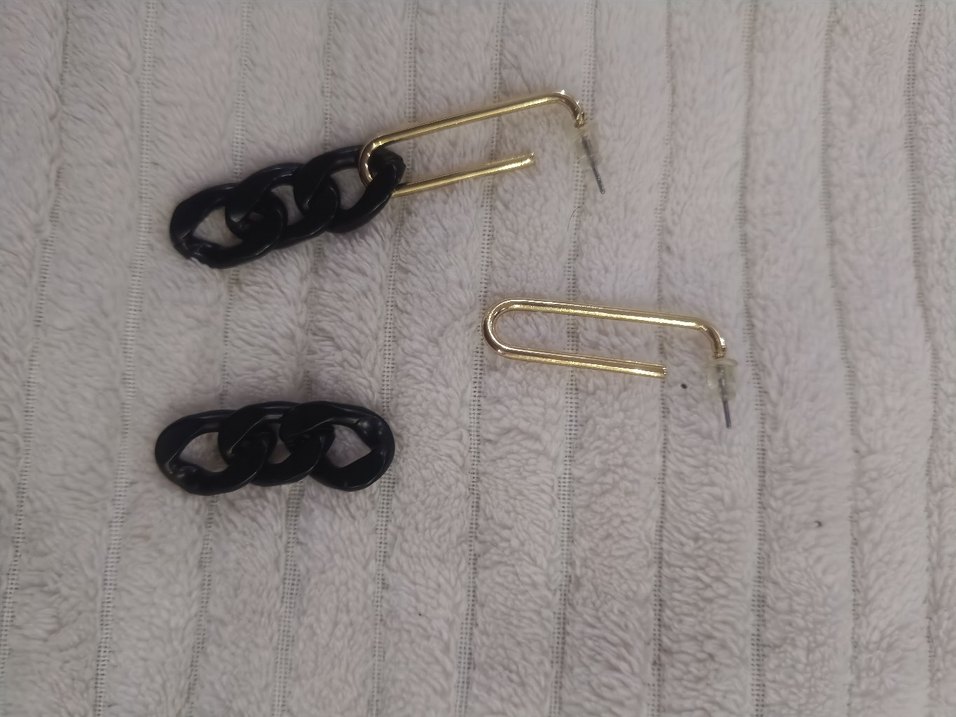 Altın renkli kancalı, siyah zincir detaylı ve yılan desenli uzun küpeler, minimalist sokak stiline uygun.