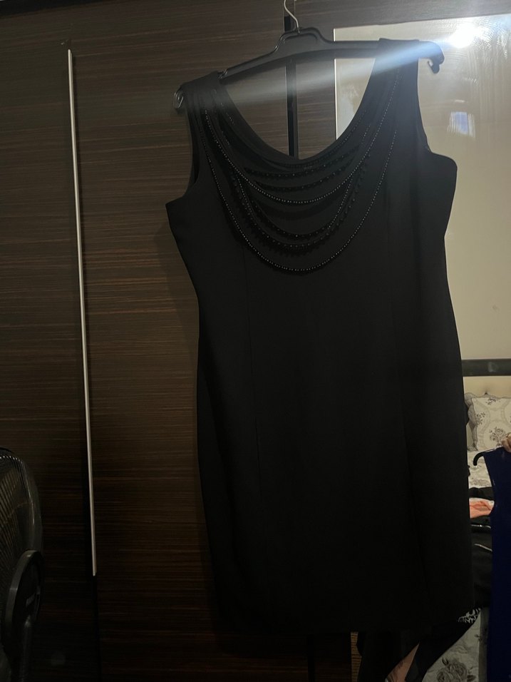 Siyah, zincir detaylı, V yaka ve kolsuz tasarımıyla klasik zarafeti yansıtan, gövdeye oturan midi elbisedir. Ofis için uygundur.
