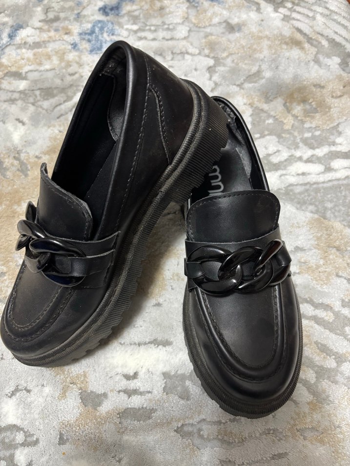 Siyah, zincir tokalı ve kalın tabanlı kauçuk kadın loafer. Günlük kullanıma uygun, goth ve sokak stiline uyum sağlar. Ürünün herhangi bir deformesi yoktur