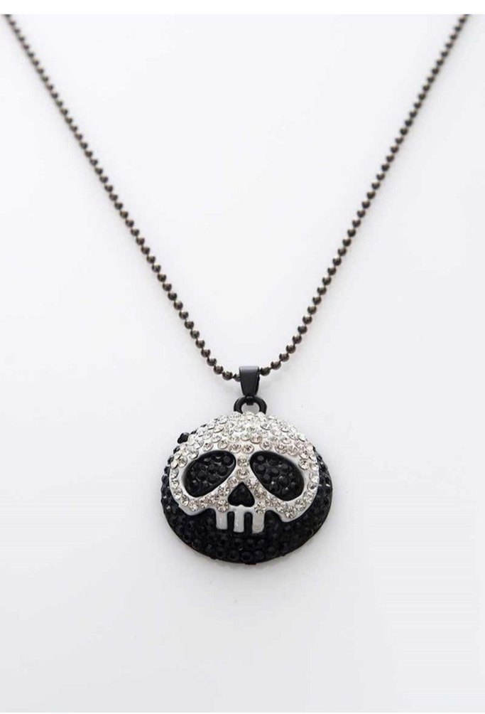 Siyah zincirli midi kolye, parlak taşlarla süslenmiş kafatası figürüyle gotik ve punk tarzını yansıtıyor.
