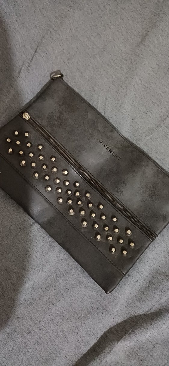 Gri deri clutch çanta, fermuarlı ve zımba detaylıdır. Rock punk tarzını yansıtarak günlük kullanıma uygundur.