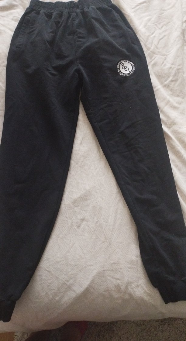 Siyah, bel bantlı, sentetik kumaştan erkek spor pantolonu. Rahat kesimi ve küçük logo detayıyla günlük ve spor kombinlere uygun. Arkasında lastikle ilk alımda delik açmışlar ama belli değil zaten tişört kapatmış oluyor. gayet iyi durumda