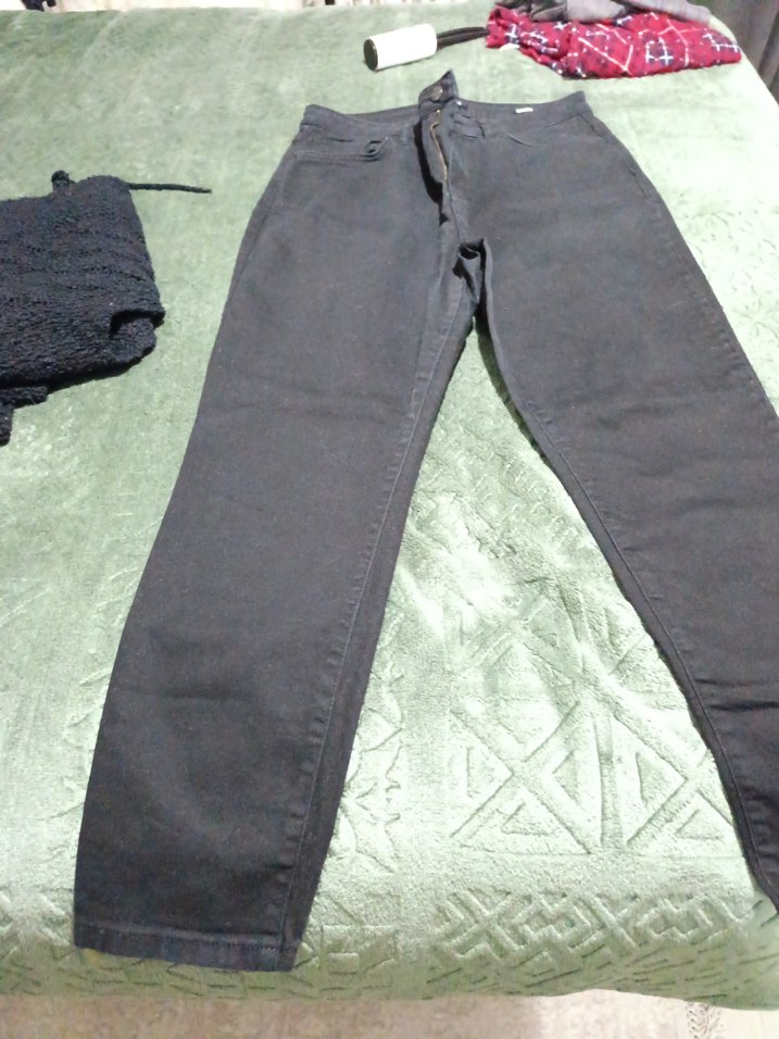 siyah renkli, düğmeli ve normal kesim kadın denim pantolon. Midi boyda, günlük kullanıma uygun sade tasarım.