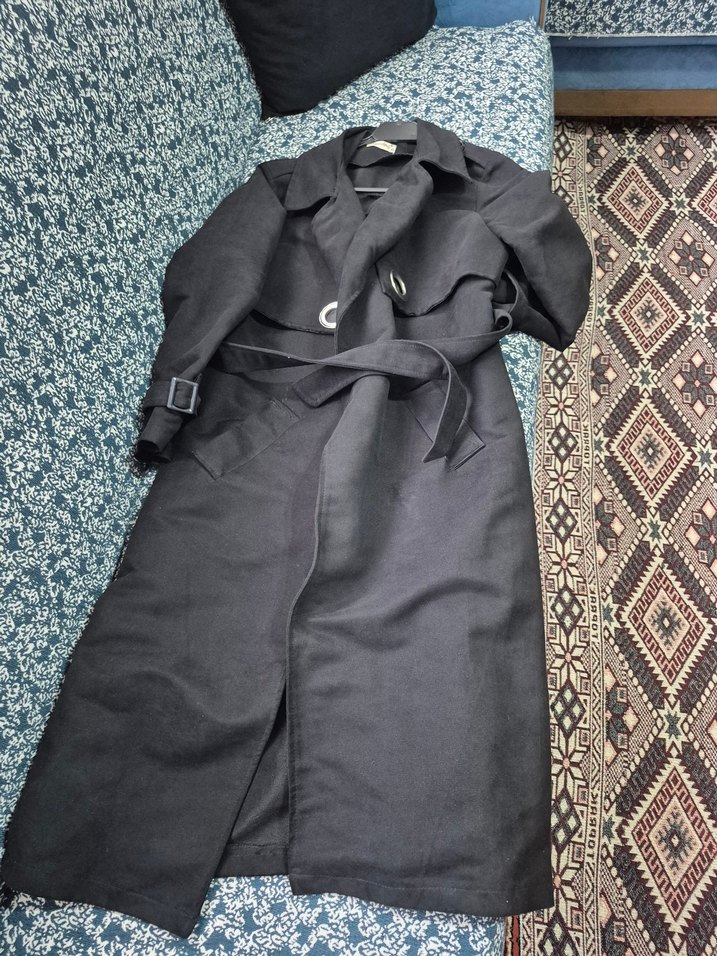 Bu uzun sıyah nubuk trençkot, yaka detaylı ve kemerli bel ile salaş, sokak stiline uygun bir kesim sunar. Uzun kollu ve desensiz, günlük kullanıma uygundur.