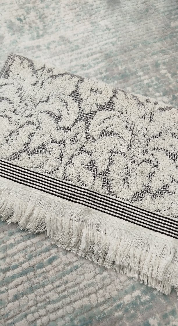 Gri renkli, nakışlı bohem desenlere sahip ve püsküllü kenarıyla detaylandırılmış havlu. Yumuşak ve emici yapıya sahiptir.