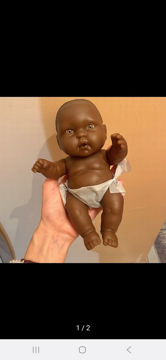 Detaylı yüz hatlarına sahip ve beyaz bez bebek bezi giyiyor, giysisi biraz hasar aldı.