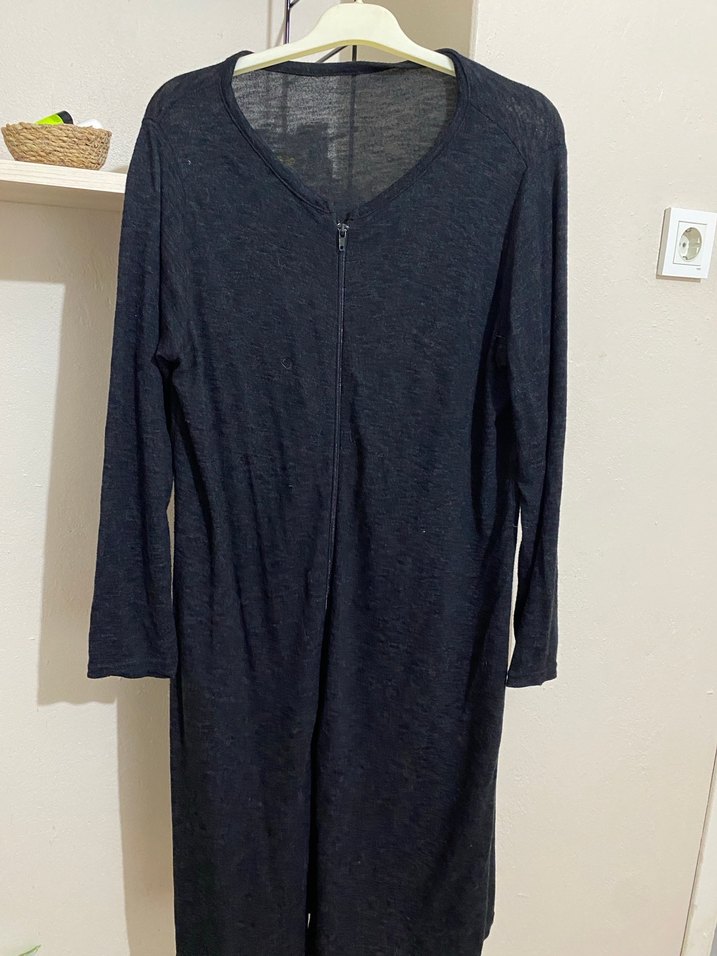 Lacivert uzun keten elbise, bol kesim, uzun kollu ve V yaka detaylıdır. Önden fermuarı vardır ve minimal, desensiz tasarımıyla günlük kullanıma uygundur.