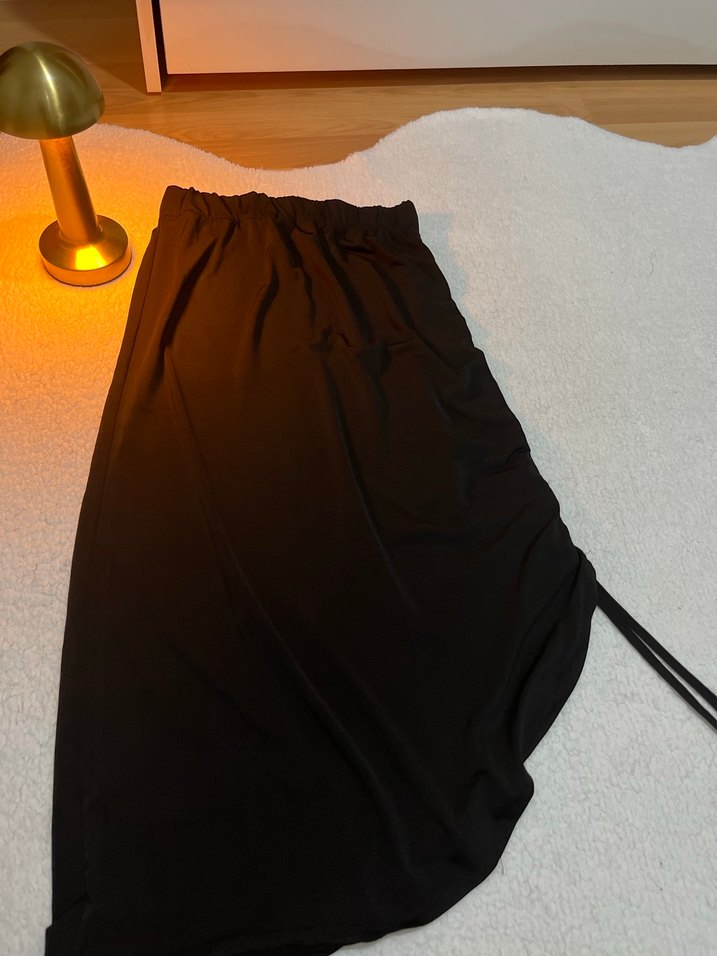Siyah,yandan büzgülü uzun kadın eteği, dökümlü kumaştan üretilmiştir. Minimalist ve avangart tarzları için uygundur.
