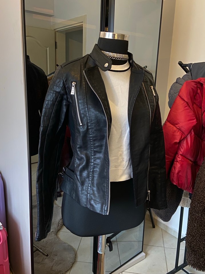 BİR İKİ KERE KULLANILDI TERTEMİZ DURUYOR GÖRSELLERDE GÖRÜMDÜĞÜ GİBİ. BEDENİ M AMA BEN S GİYORUM BANA TAM OLDUĞU İÇİN S İŞARETLEDİM.Siyah deri biker ceket, yüksek yakalı ve fermuarlı detaylara sahip. Uzun kollu, normal midi boyda, sokak stiline uygun ve günlük kullanıma ideal.