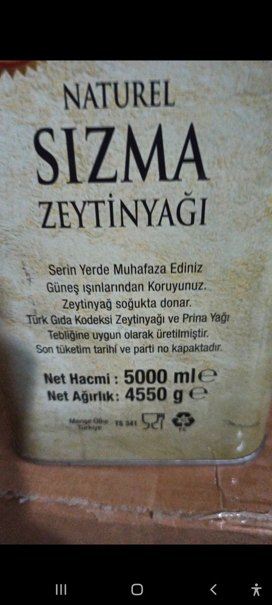 5000 ml net hacimli, 4550 g net ağırlıklı sızma zeytinyağı. Serin yerde muhafaza ediniz, güneş ışınlarından koruyunuz. Türk Gıda Kodeksi'ne uygun üretilmiştir.