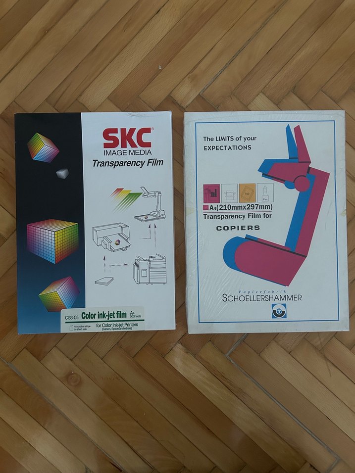 SKC renkli mürekkep püskürtmeli yazıcılar için ve Schoellershammer fotokopi makineleri için A4 boyutunda şeffaf film seti.