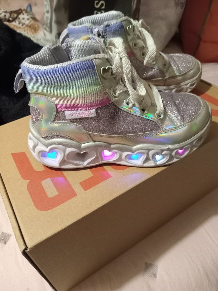 Skechers 27 numara Işıklı kalp detaylı, parlak simli ve batik desenli kız çocuk spor botu, Sokak stiline uygun çok renkli tasarım. herhangi bir deformasyonu yoktur yeniden farksızdır şimdiden alıcısına güzel günlerde kullanması dileğimle...