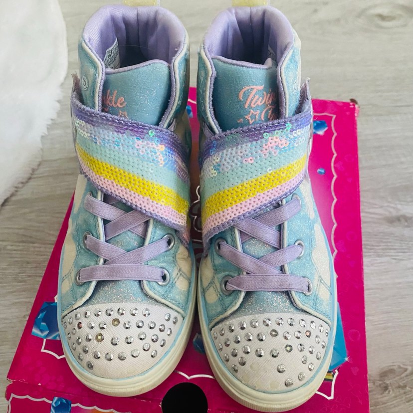 Kız çocukları için pastel tonlarda, çok renkli tie-dye desenli, velcro bantlı spor ayakkabılar. Kauçuk taban dayanıklılık sağlar. Twinkle Toes by Skechers markası.Göründüğü gibi kullanıma engel durumu yok.İç taban ölçüsü 18.5 cm