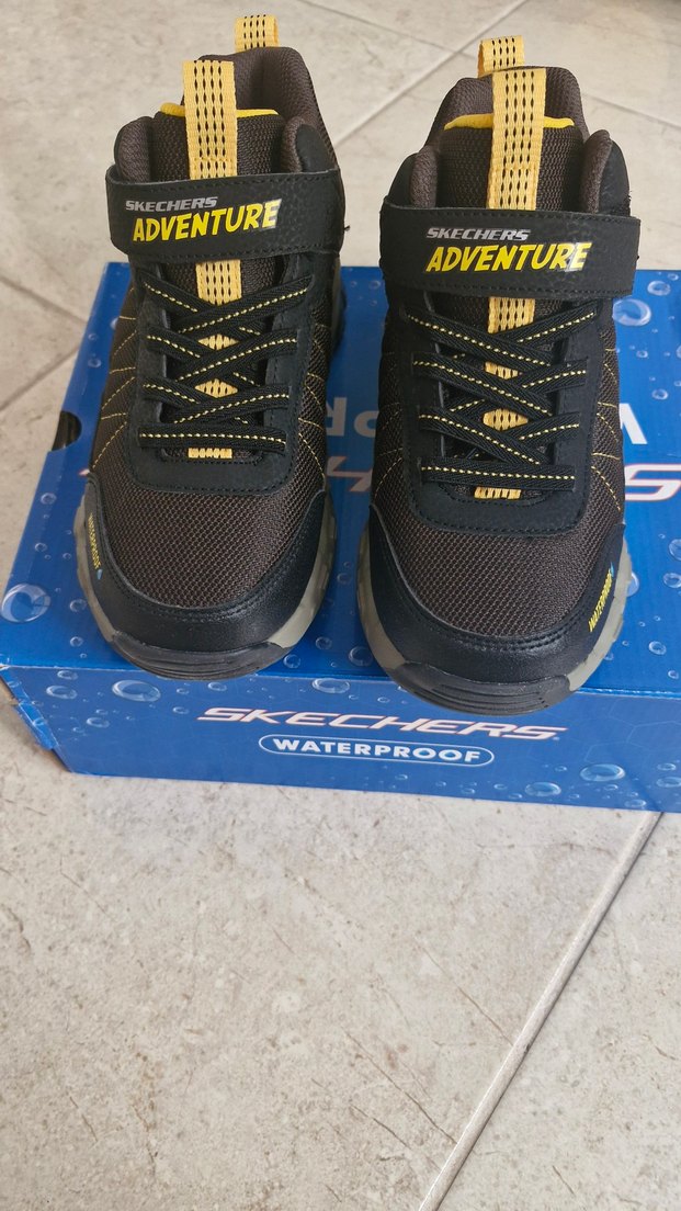 Ürün hic kullanılmadı. Oğlumun ayagi büyüdüğü icin kullanmadan satmak zorunda kaliyorum. Skechers Adventure erkek çocuk spor ayakkabısı, su geçirmez koyu sarı kauçuk malzemeden, baskılı detaylıdır. Cırt cırtlı ve sokak modası tarzındadır.