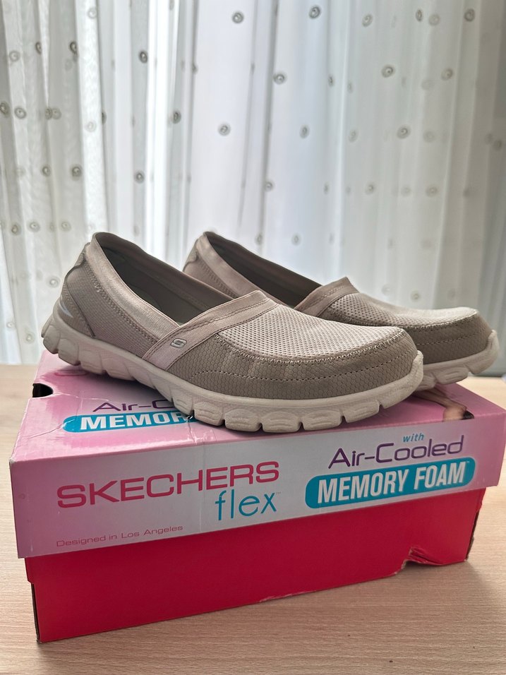 Skechers marka Babet tarzında Spor ayakkabı, bej renk, 37 numara, Orjinal kutusunda, Skechers mağazasından satın alınmıştır. Çok az giyildi. Yumuşak nefes akan kumaş, Kolay giyilip çıkarılabilen, yastıklı ve hafızalı köpük tabana sahip çok rahat bir ayakkabı. Sıfırı 4000 TL