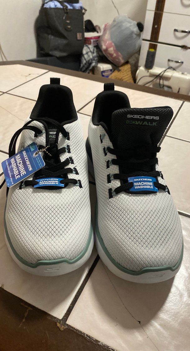 Skechers markalı, beyaz file üst yüzeyli, gri detaylı, siyah bağcıklı erkek spor ayakkabısı. Rahat sokak stili için yumuşak tabanlı ve makinede yıkanabilir.