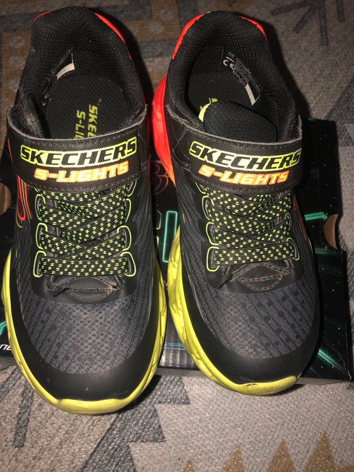 Skechers markalı, desenli koyu üst yüzeye ve canlı sarı detaylara sahip,ışıklı kauçuk tabanlı, cırt cırtlı erkek çocuk spor ayakkabısı. Sokak stiline uygun.