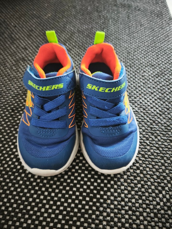 Skechers marka, mavi ve turuncu renklerde renkli desenli çocuk sneaker. Kauçuk tabanlı ve kolay giyilen cırt cırtlı, sokak tarzına uygun.