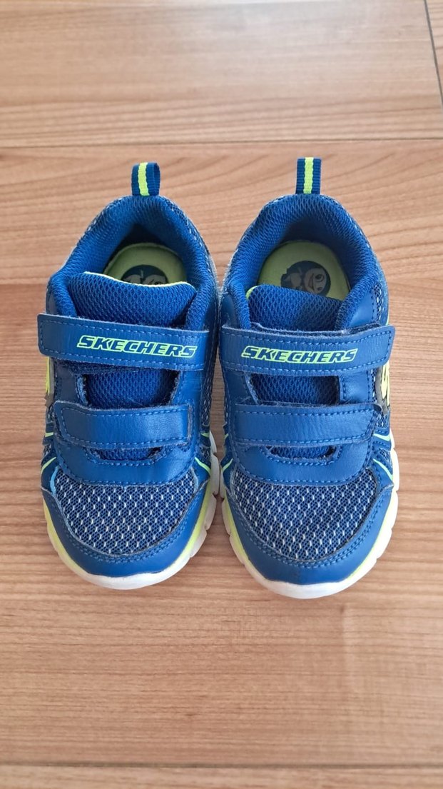 Mavi renk Skechers erkek çocuk spor ayakkabısı, renkli sokak stili, cırt cırtlı ve kauçuk tabanlıdır.