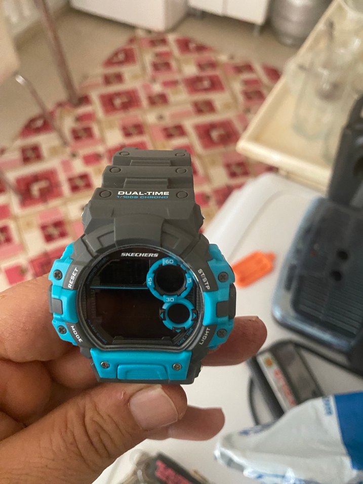 Skechers markalı erkek dijital saat, koyu ve turkuaz renklerde, çift zaman özelliği ile athleisure tarzını yansıtıyor. ⌚