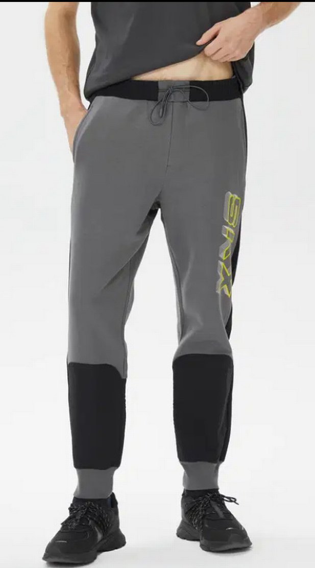 Sentetik kumaştan üretilmiş, belden bağlamalı ve baskılı desenli gri, bol kesim erkek spor eşofmanı. ♂️