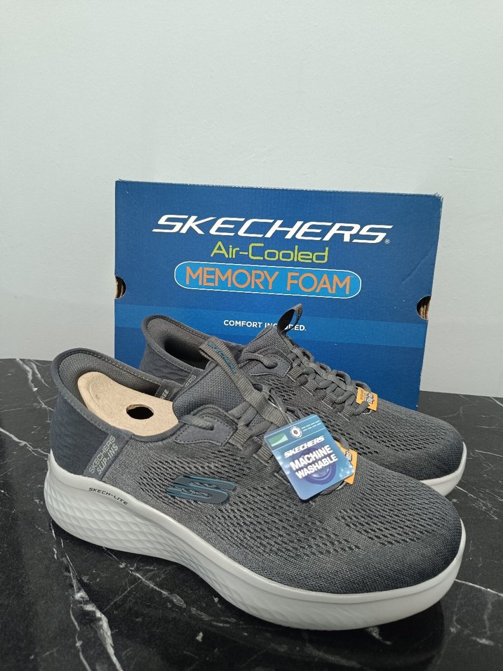 Gri Skechers erkek spor ayakkabısı, hafızalı köpük iç taban ve velcro bantlı kauçuk taban ile rahat kullanım sunar. güncel mağaza fiyatları 5000 TL ve üzerindedir