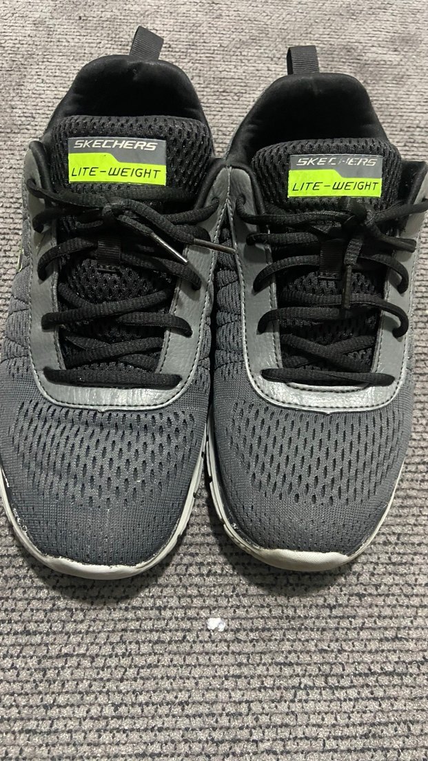 Skechers gri spor ayakkabılar, hafif tasarım ve elastik detaylara sahip, düz kauçuk tabanlıdır. Rahat ve nefes alabilir kumaştan üretilmiştir.