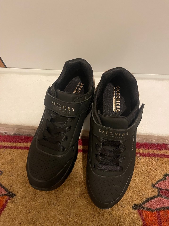 Skechers marka, siyah renkli, dolgu topuklu ve cırt cırtlı kadın spor ayakkabısı, parlak kauçuk tabanlı, sokak modasına uygun.Kızıma aldım küçük geldi 1/2 kez giyildi