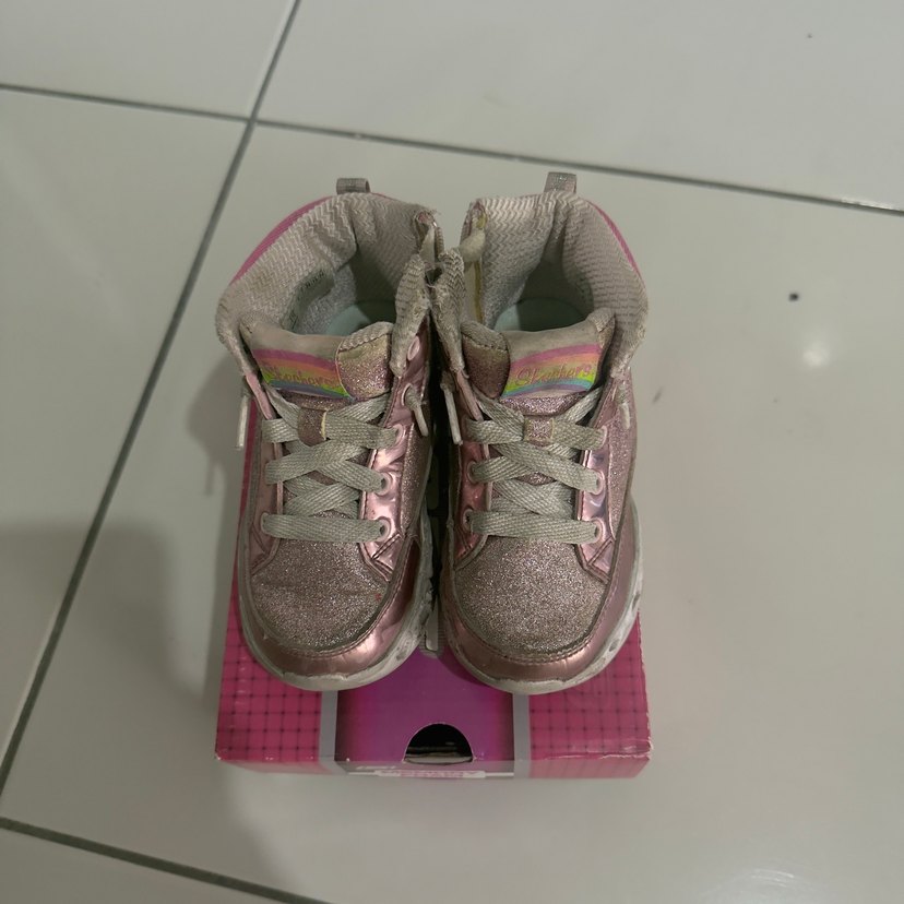 Skechers marka kız çocukları için pembe simli, kauçuk tabanlı spor ayakkabılar. Renkli ve desen içermeyen şık bir sokak giyimi modelidir. Göründüğü gibidir ışıkları yanıyor