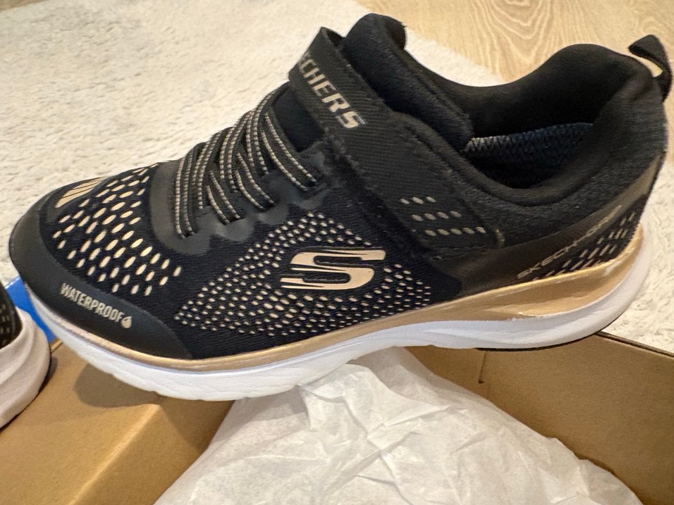 SATILDI. Siyah renkli, baskılı gold desenli kız çocuk spor ayakkabısı, cırt cırtlı ve kauçuk tabanlıdır. Trendy casual tarz için uygundur. Su geçirmez özellikli.