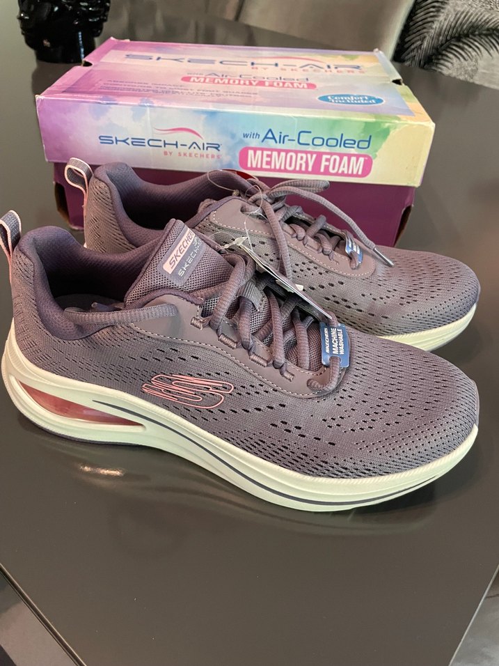 Mor renkli Skechers spor ayakkabılar, dolgulu hafızalı köpük ve hava alan tasarımıyla rahatlık sağlar. 38 numara çok şık ve çok tatlı bir rengi var. İnanılmaz rahattır,kutusu biraz deforme oldu