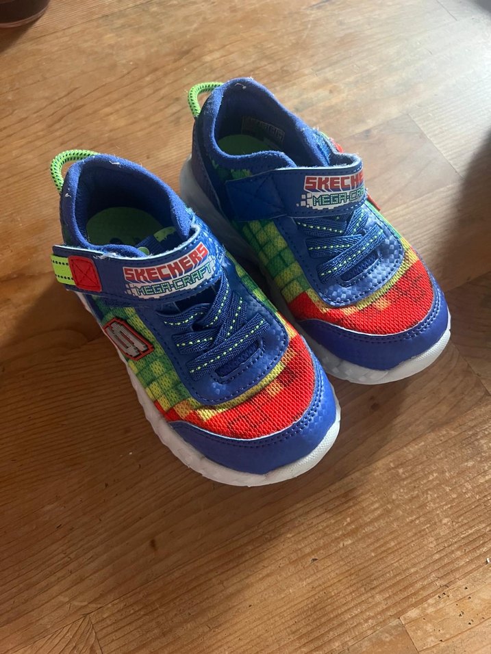 Velcro bantlı, bağcıksız, renkli tie-dye desenli erkek çocuk spor ayakkabısı. Kauçuk tabanlı, Skechers markalı, sokak stiline uygun.