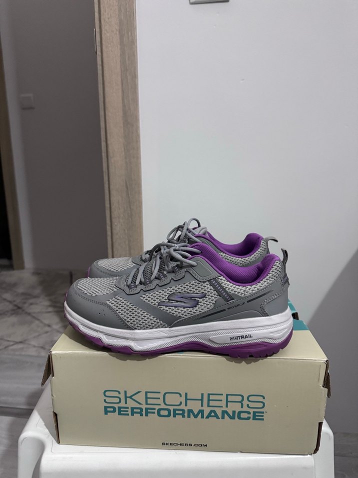 Skechers Performans mor ve gri renklerde, baskılı desenli kadın spor ayakkabısı. Platform topuklu, elastik detaylı ve kauçuk malzemeden üretilmiştir.