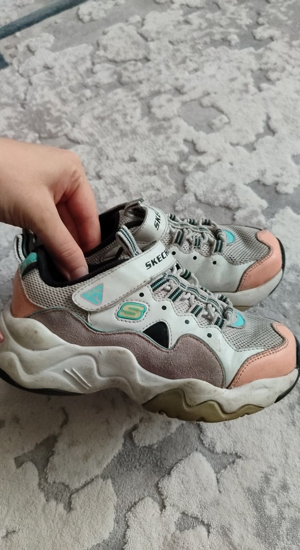Skechers marka, bağcıklı ve lastik tabanlı, pastel tonlarda ve tie-dye desenli spor ayakkabılar.