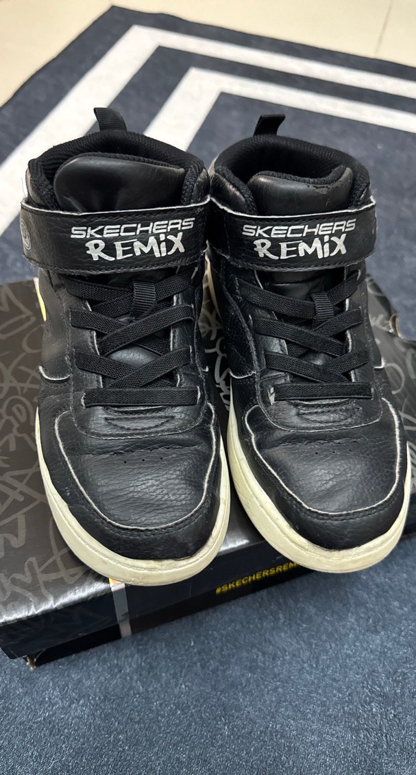 Skechers Remix marka siyah, desenli olmayan, cırt cırtlı ve bağcıklı çocuk spor ayakkabısı. Kauçuk tabanlı, sokak modasına uygun. Fotoğrafta görüldüğü gibi küçük kusurları var ışıkları yanıyor başka deformesi yoktur