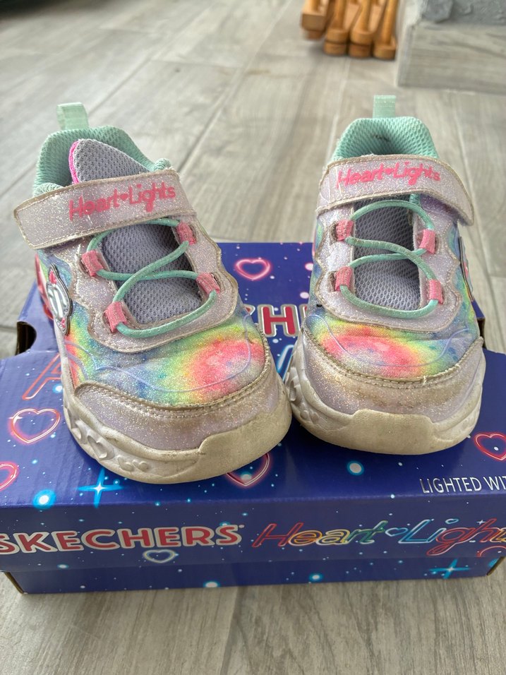 Renkli tie-dye desenli, cırt cırtlı ve ışıklı detaylı kız çocuk spor ayakkabısı, kauçuk tabanlıdır. Kullanıma bağlı yıpranmaları mevcuttur. Işıkları yanmaktadır.