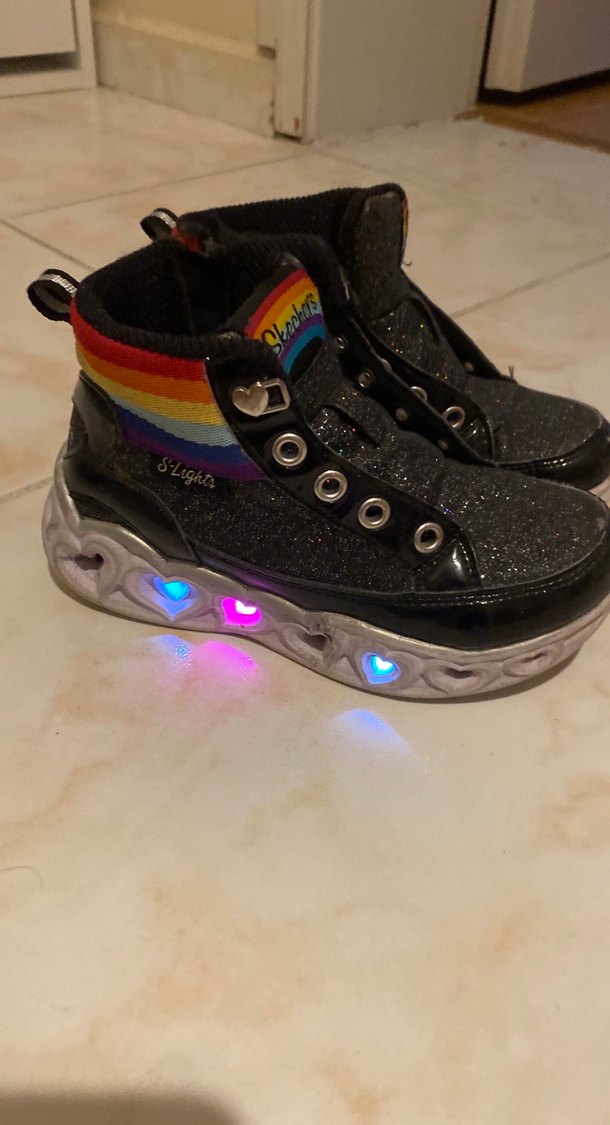 Renkli tie-dye desenli, simli ve tabanında ışıklı kalp detayları olan kız çocuk spor ayakkabısı. Kauçuk tabanlı, sokak tarzına uygun. "S-Light" yazılı. 28 numara