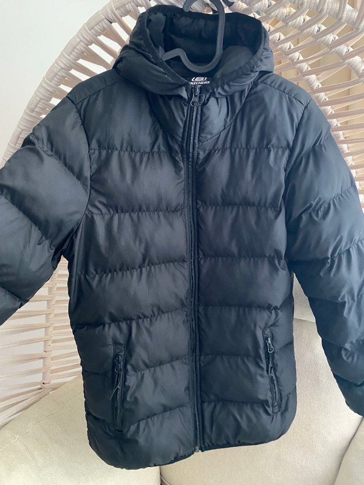 Siyah, kapüşonlu, fermuarlı ve uzun kollu kadın kışlık mont. Rahat ve sıcak tutan yumuşak kumaştan, midi boyda, şık sokak stili için uygun.
