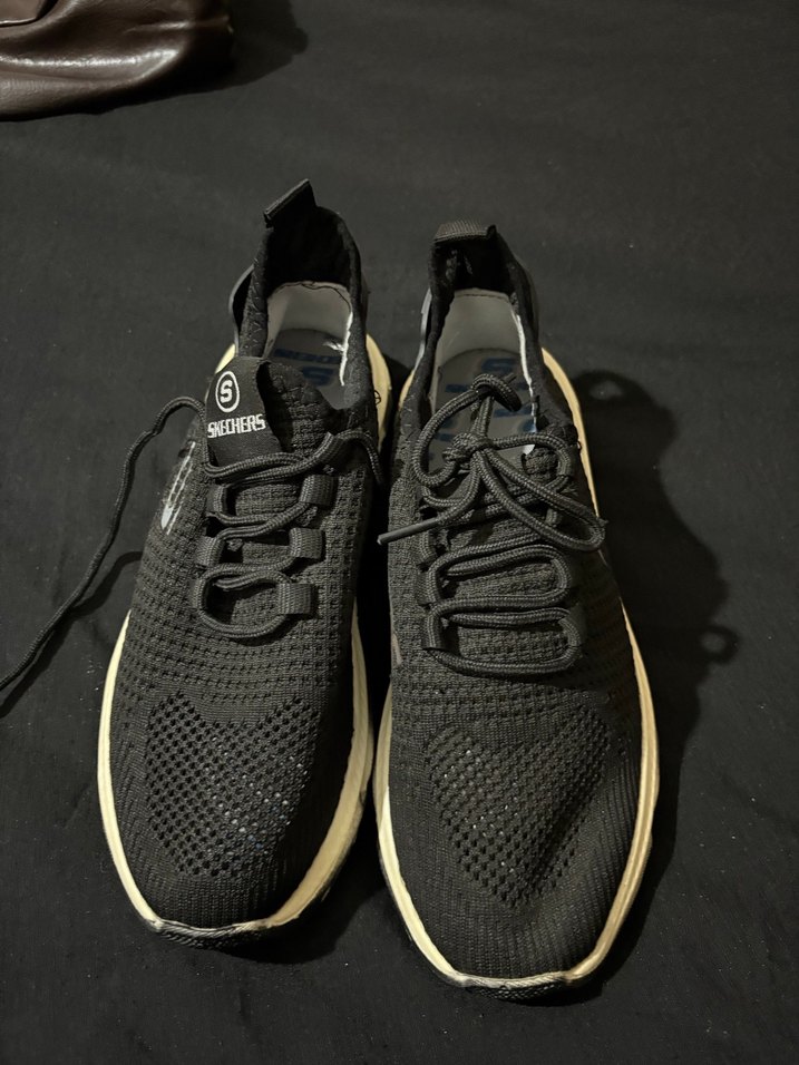Siyah Skechers erkek spor ayakkabısı, bağcıklı tasarım ve kauçuk tabanlıdır.